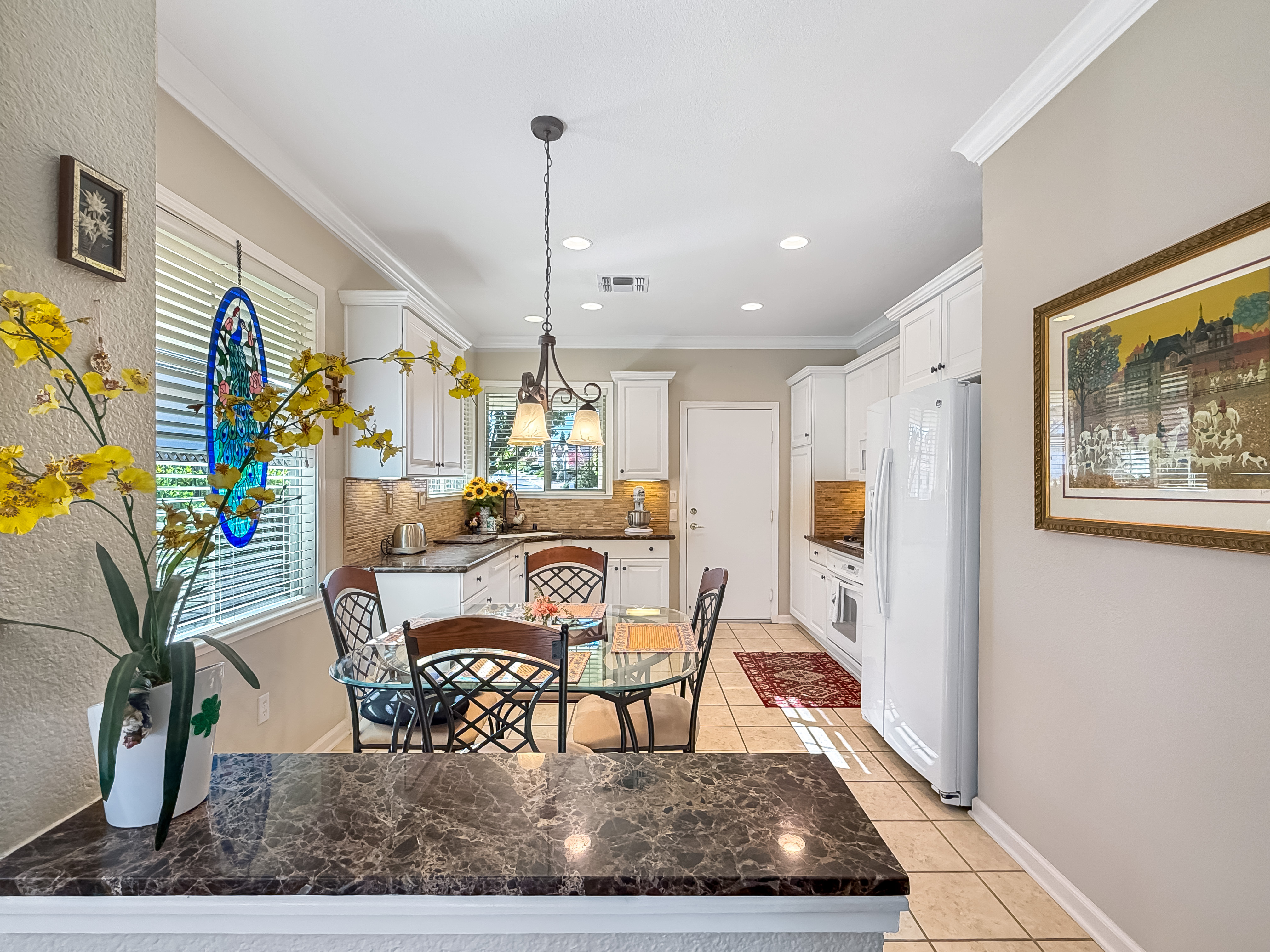 Step inside and you’ll immediately notice the well-kept condition of the home. The LVP flooring adds warmth and durability, while crown molding frames the space with a refined touch. The solid-surface counters and seamless integrated sinks offer a clean, modern look that’s also incredibly easy to maintain.