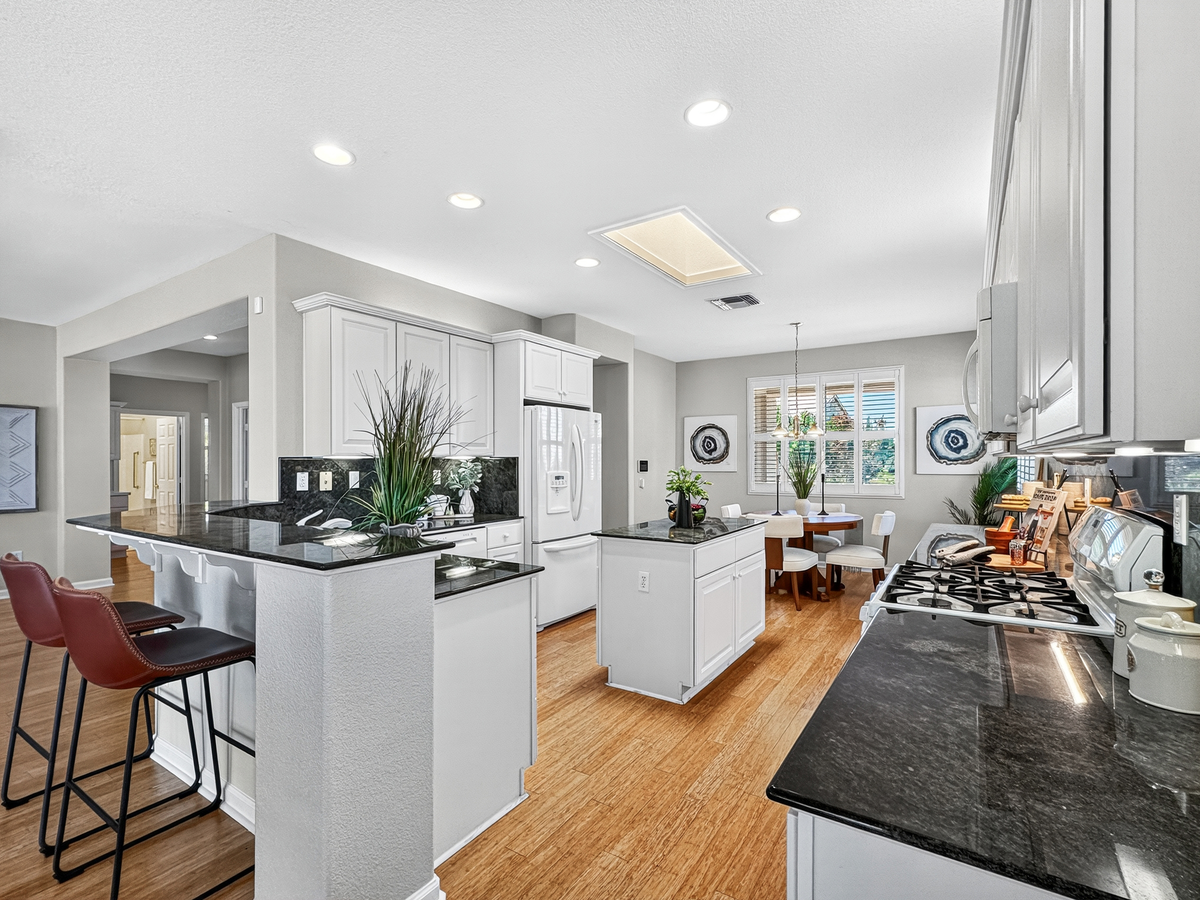 A stylish granite kitchen with white upgraded cabinets and convenient pull-out shelves